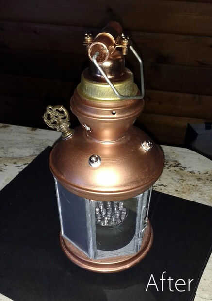 Este Instructable incluye una introducción, una lista de materiales sugeridos, algunas instrucciones y sugerencias y fotos de mi linterna de campamento 'steampunked'. He tomado una linterna de arte 99 centavos y reconstruido en una moda steampunk. Hice uso de los materiales disponibles en mi tienda con el compromiso de mantener mi total bajo costo $10. Ya que mis materiales re-purposed probablemente será diferentes de lo que otros pueden tener disponibles, este instructable sirve más como una inspiración que como una descripción paso a paso.