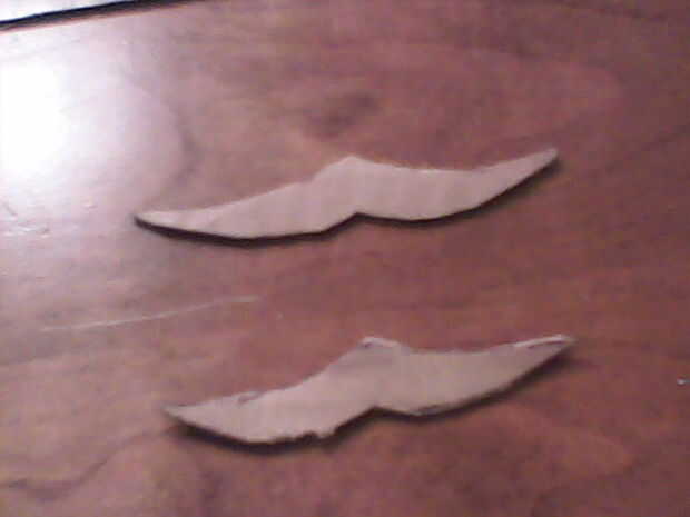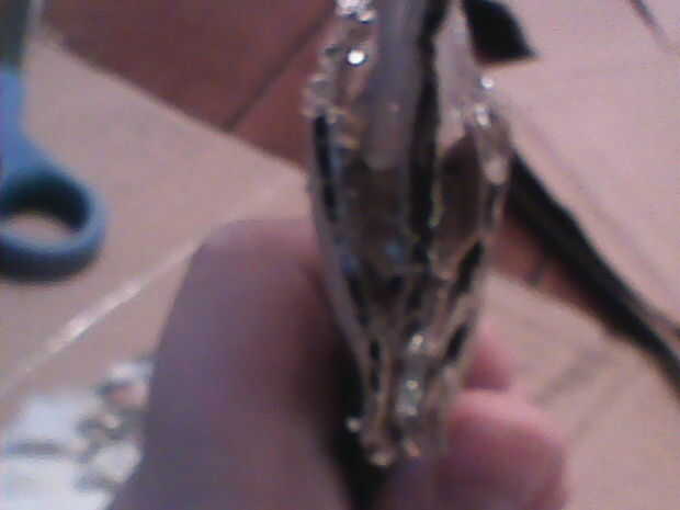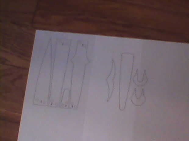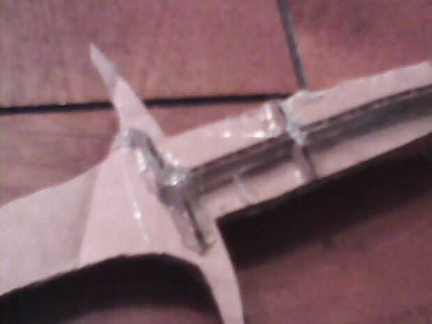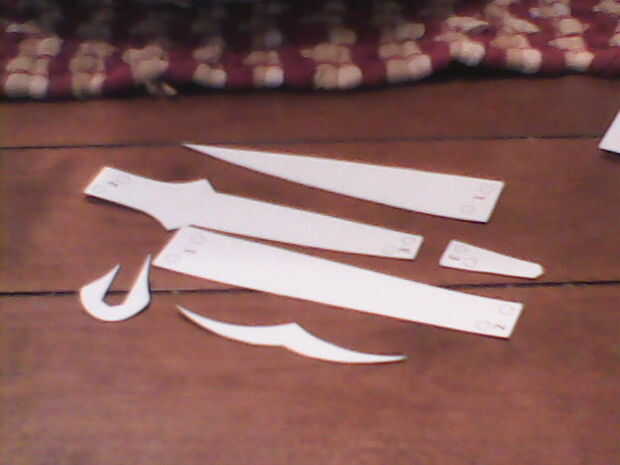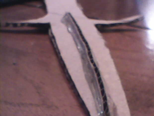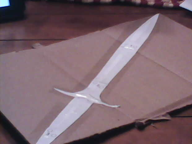 usé para cortar el "patrón de hoja/grip" del instructable "Sting – Señor de los anillos". Os adjunto todas las piezas de hoja junto con el patrón de la manija y grabó la Guardia derecho sobre eso. Cinta el patrón en cartulina y recórtalo. También encogi el patrón hasta 60% para obtener una espada más pequeña pero tamaño incumbe a usted. A continuación pegué sobre una espina dorsal a lo largo de la empuñadura hasta la mitad de la guardia. Que sea solo una tira de cartón. Pegué pequeños óvalos media sobre la columna vertebral. Solo 2 de cada lado. A continuación, pegué una línea larga y recta de pegamento caliente a lo largo de la hoja. Repita en el otro lado. Luego, cortar 2 guardias y había pegado en el óvalo de la mitad superior de la columna vertebral. Doblar todos los extremos de los guardias y les pellizque todo junto en los extremos y pegar en su lugar. Rellenar todos los bordes de la cartulina de la guardia con pegamento caliente.