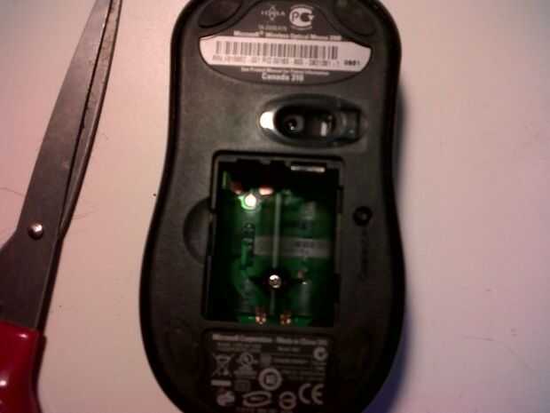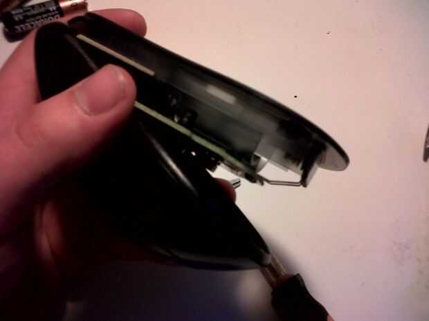 Las dos mitades del ratón se mantienen unidas por un solo tornillo situado detrás de la puerta de la batería. Después de quitar el tornillo con cuidado separe las dos mitades a partir de la parte trasera del ratón.