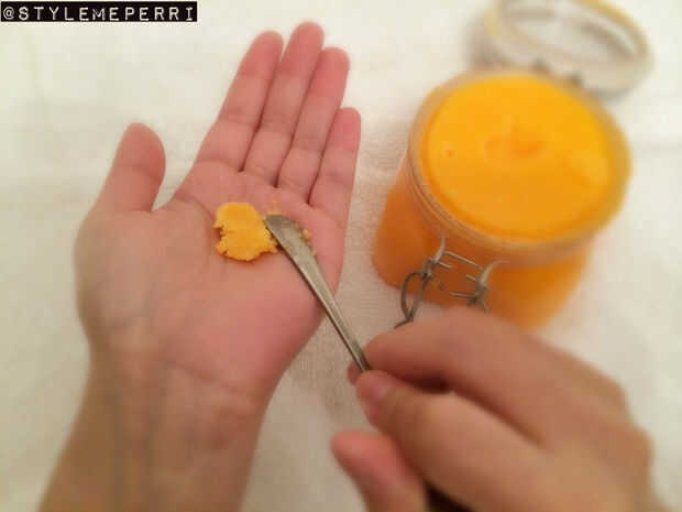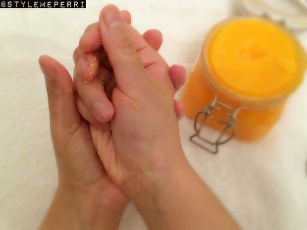 Tip!: Si usted siente el scrub es un poco demasiado abrasivo seco para las manos, agregar agua un poquito a la vez hasta las diapositivas exfoliante cómodamente en sus manos.