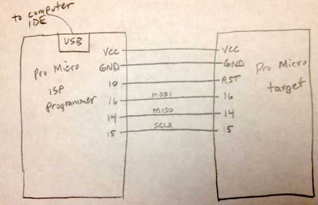 Voy a cubrir usando un Micro Pro como un programador ISP para grabar el bootloader en otro Micro Pro, pero puede utilizar cualquier Arduino como el programador ISP. Hay un cambio menor para hacer el dibujo de ArduinoISP de ejemplo que viene con el Arduino, en orden para que funcione en un Micro Pro.