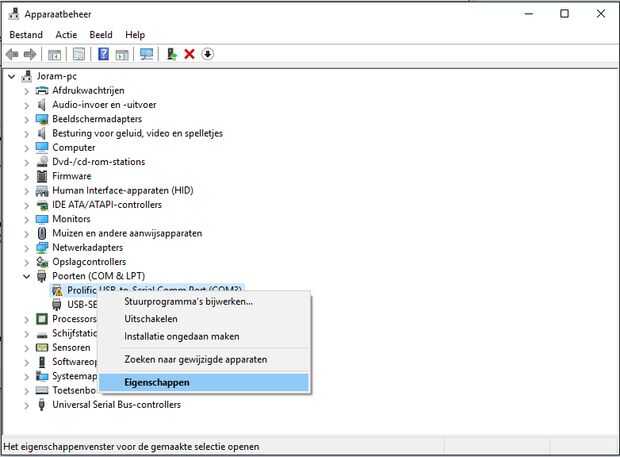 - Haga clic derecho sobre el prolífico USB a puerto Serial COM y haga clic en propiedades