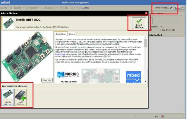 En mi temprana instructable, dije cómo utilizar código en línea de developer.mbed.org desarrollo de sitio web para programar nRF51-DK, ahora mientras se está utilizando el compilador de mbed para, seleccione nRF51822 como su plataforma para compilar los códigos para el chip nRF51822 estar listo para el envío de que este código a tu Faro vía tablero del nRF51-DK está conectado al ordenador mediante cable usb. (Ver la foto de arriba, añado una foto cómo elegir una plataforma).