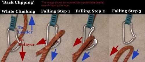 Recorte trasero es donde la cuerda se ha recortado en la dirección equivocada, es decir la cuerda va al trepador está saliendo de la parte posterior del mosquetón en lugar del frente (esto puede resultar en el cable se desenganche durante una caída). Recorte de Z es donde el escalador ha recortado la cuerda por debajo de su última cinta exprés en el siguiente (el cable va desde el suelo hasta el siguiente exprés hasta la última de ellas y luego al trepador lo que significa ti no protegen de ninguna manera)