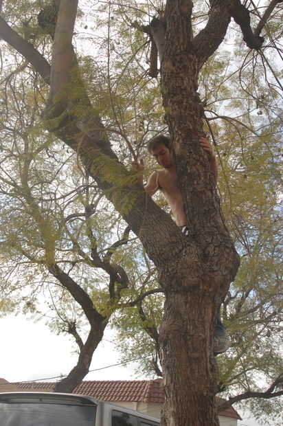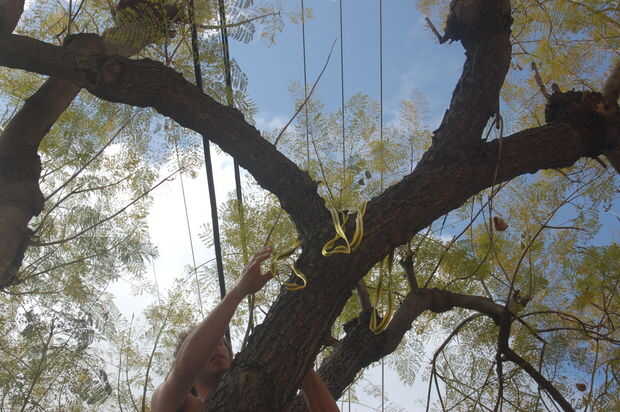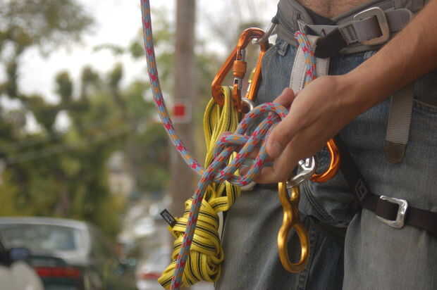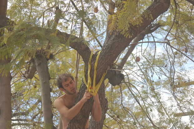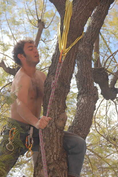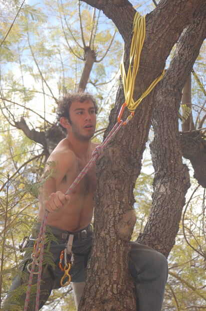 Broma subió el árbol primero, usa cintas para fijar la cuerda y luego vuelan hacia abajo con un 8, para comenzar la verdadera escalada de árbol.