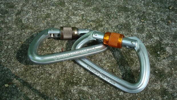 1. tener al menos un cierre mosquetón. Asegúrate de tener uno que se hace para subir! Los que he cuestan $7 cada uno, comprados en el REI. Son capaces de mantener 25kN (que es cerca de 5.600 libras)
