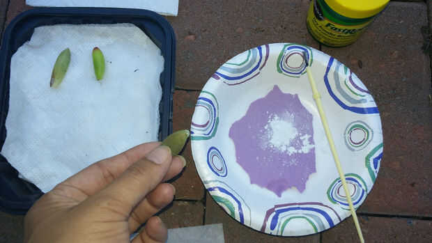 Si usted decide usar la hormona de enraizamiento, toque una pequeña cantidad a utilizar en un recipiente desechable o placa. Lo hice en un papel en un recipiente de papel para que el polvo blanco sería visible, y puedo tirar todo lejos luego.
