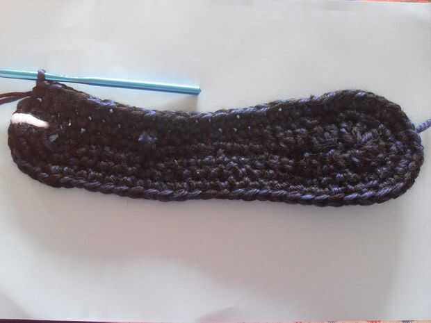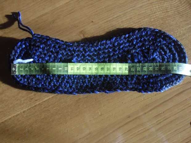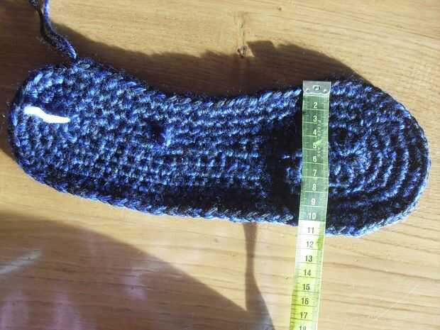 Después de medir, decidí qué tamaño para hacer y vieron la tabla en pdf para obtener instrucciones. Usé un tamaño de gancho de 6,5 mm y dos colores de hilos para hacer la suela más gruesa. Si quieres hacer un color, simplemente use un hilo grueso.