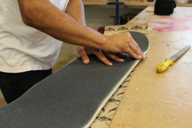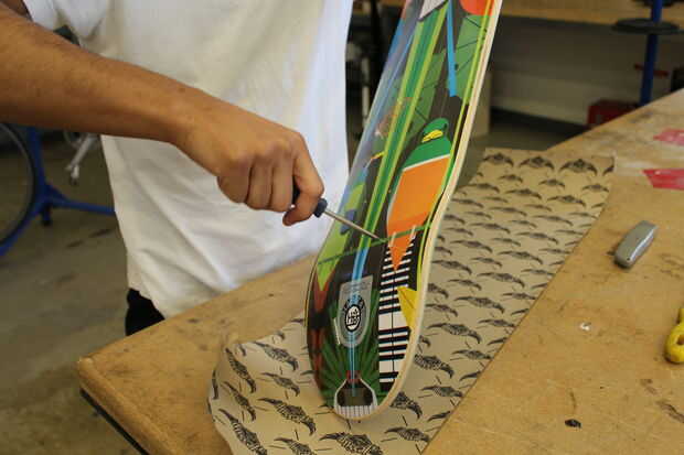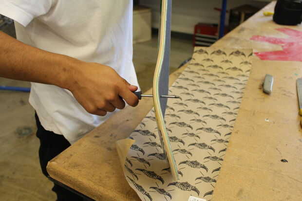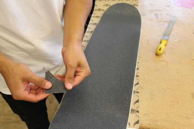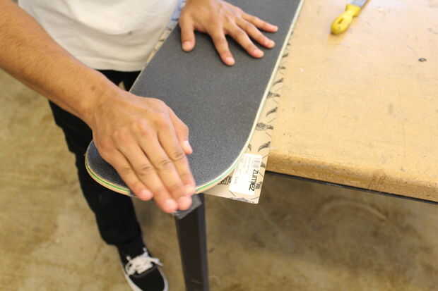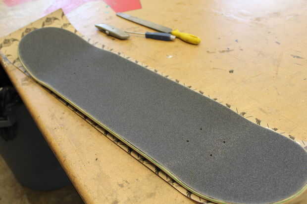 Para el último paso, use un pedazo de la griptape exceso que fue cortado y usarlo como un pedazo de papel de lija. Pulir el borde de la griptape para quitar cualquier exceso piezas y darle a la junta una mirada limpia. Por último, utilizando un destornillador empujar 8 agujeros para el hardware. Y es como un monopatín. Se apoderó de mina en TechShop.
