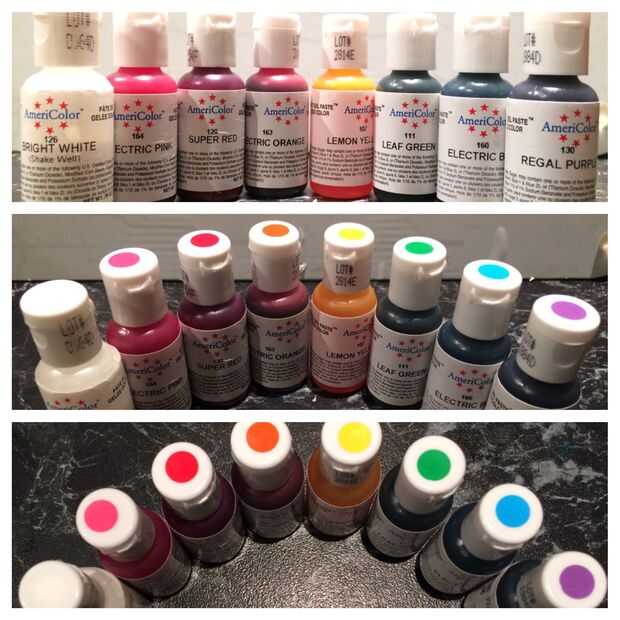 Mi favorito absoluto, la marca que utilizo más y han tenido los mejores resultados con es Americolor. Vienen en una botella del apretón, por lo que son muy fácil de usar. La mezcla suavemente y se mezclan muy fácilmente para hacer cualquier color que desee.