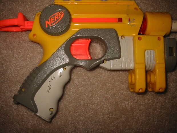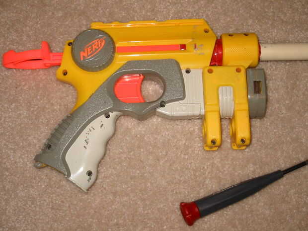pistola Nerf A es, simplemente, una pistola de juguete de plástico que dispara espuma dardos. Sin embargo, el arma no es tan fuerte lo suficiente como nos gustaría, y fuera de caja, realiza en ninguna parte cerca de su capacidad. Hasbro ha instalado