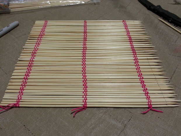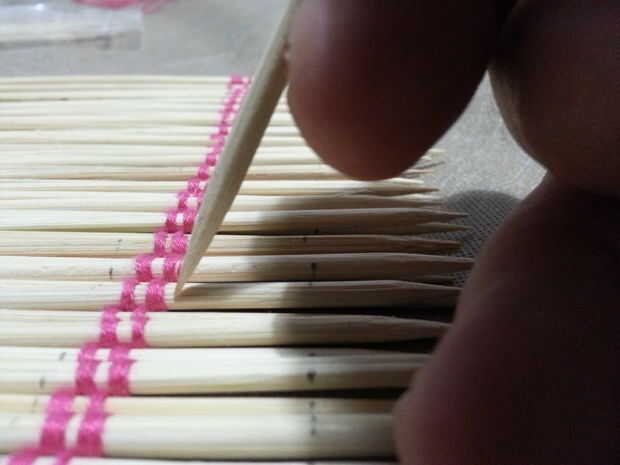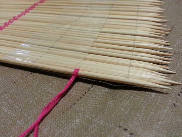 También mantener el hilo bastante flojo para que los pinchos no se manojo, todavía apretado lo suficiente como para que no deslice fuera de la estera.