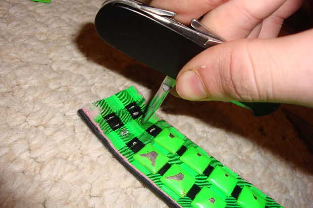 esto tiene que ser más "Rockstar" de lo que he hecho hasta la fecha. Comencé con una pulsera de cuero del pun ¢ o de la tienda de artesanía y corte seis agujeros espaciados uniformemente usando un sacador de cuero. Entonces tomé seis conchas de