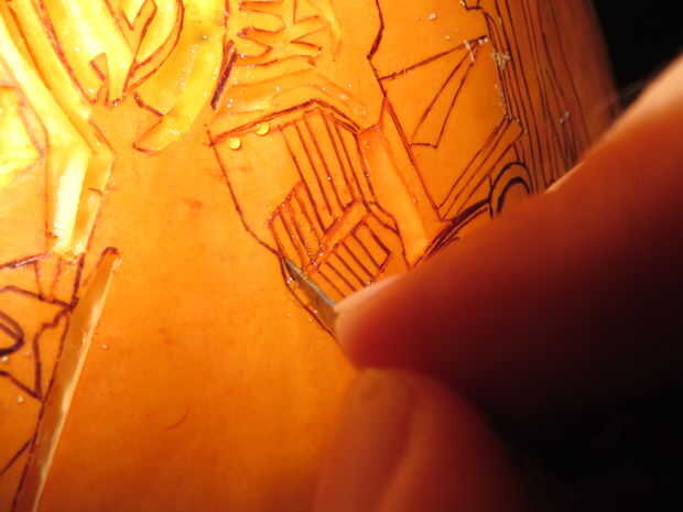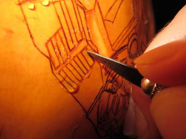 La lámina se utiliza para cortar en la profundidad deseada alrededor de las líneas previamente trazadas. Una vez que se corta el detalle, la hoja es entonces dio vuelta a su lado y solía pop la pieza previamente cortada de calabaza.
