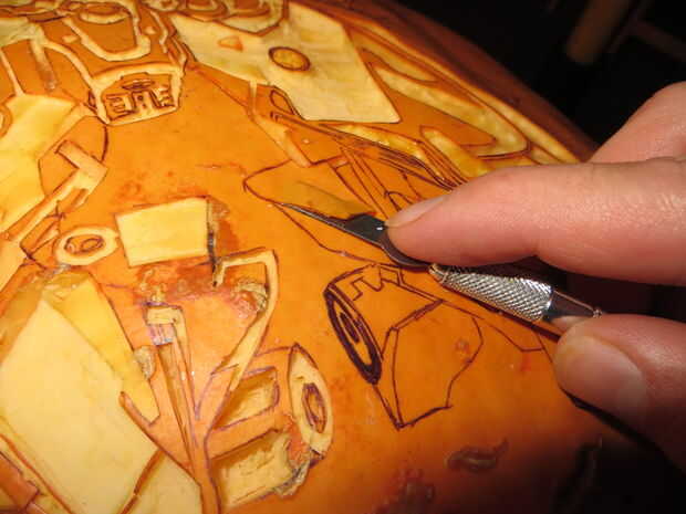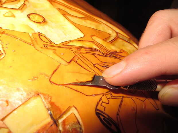 Utilice el cuchillo x-acto punta plana piezas lejos "plano" de la calabaza. Esto se hace en varias profundidades, permitiendo más o menos luz a través de dependiendo si se toma más o menos calabaza carne.