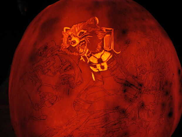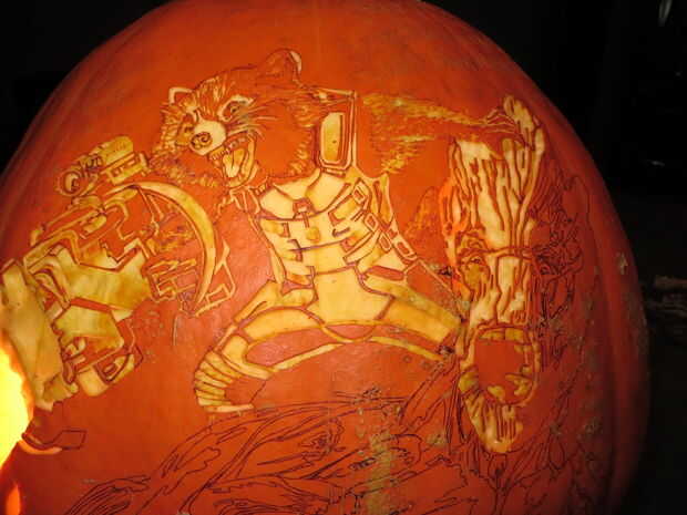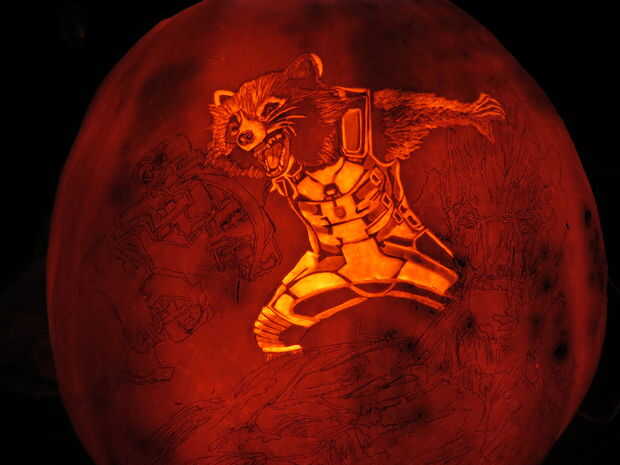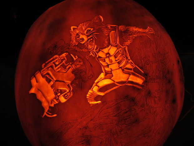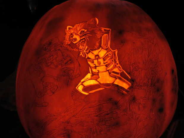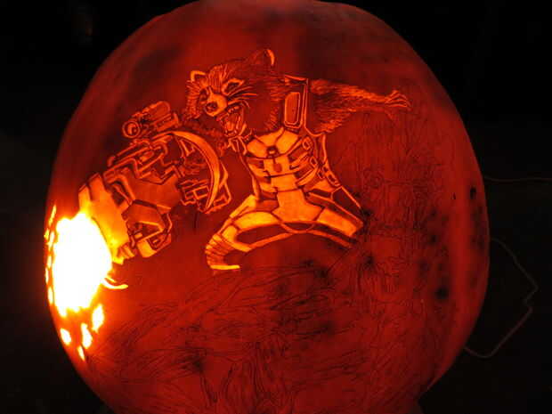 Como dije no funcionaba exactamente de la parte superior izquierda a inferior derecha. Empecé con la cara de cohete, como en el paso anterior. Luego se trasladó a su cuerpo, y luego su arma, aunque yo recomendaría comenzar con los detalles de la pistola primero. Guardar la descarga del arma grande para el final, que es tallado hasta la calabaza.