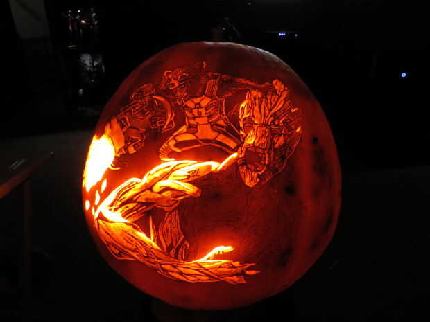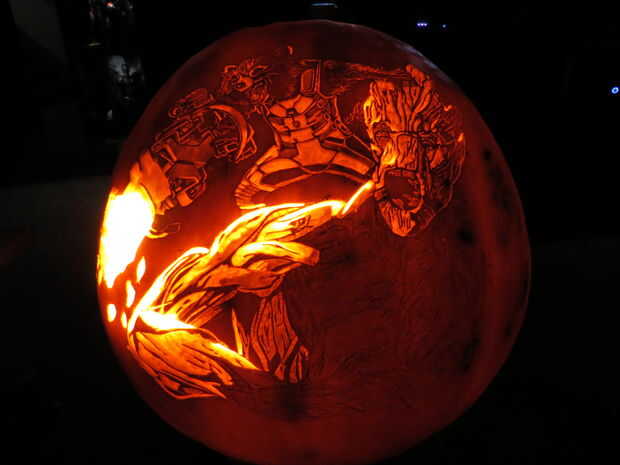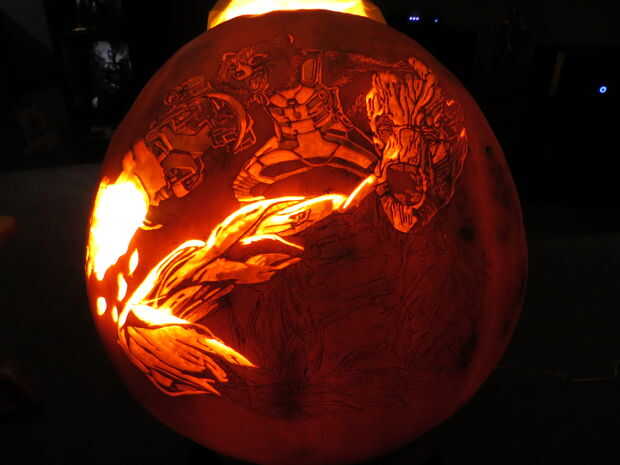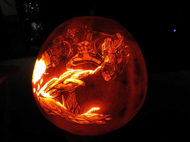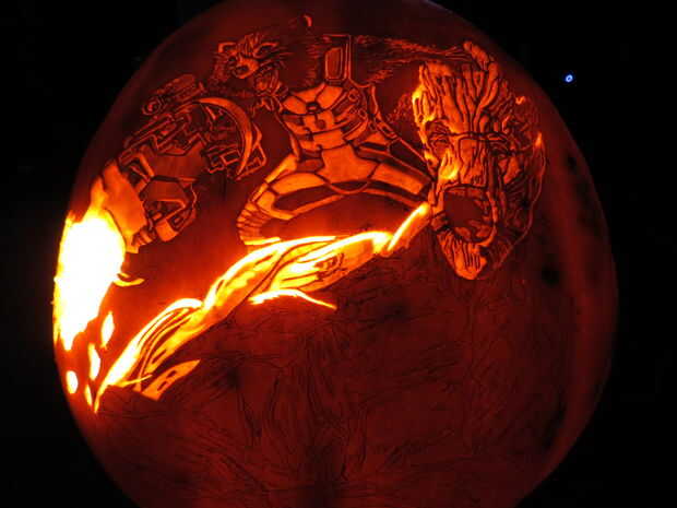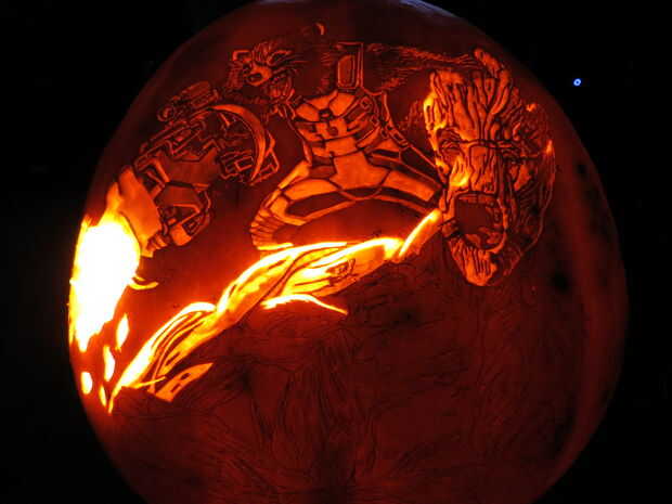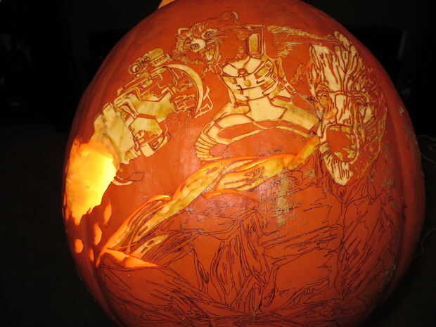 Hay zonas muy grandes, largo brazo de Groot donde la calabaza está tallada por dejar que toda la luz a través. Esto se hace para dar la apariencia de la luz de la pistola de cohetes que refleja de su brazo. Una vez más, recomiendo que talla estas áreas después de haber tallado los detalles más finos a su alrededor.