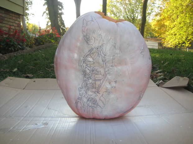 Así que esto es un nuevo paso estoy recomendando este año. Después de probar la iluminación dentro de la calabaza, me di cuenta lo permitido calabaza demasiada luz a través de su piel, y la luz se fuga muy no-uniformemente. Como resultado te recomiendo color de pintura la calabaza una luz. Esto permite que el patrón demuestre a través mientras que en la misma tarde de la hora a la iluminación a través de la piel de calabaza y carne.