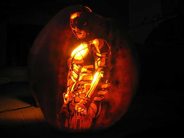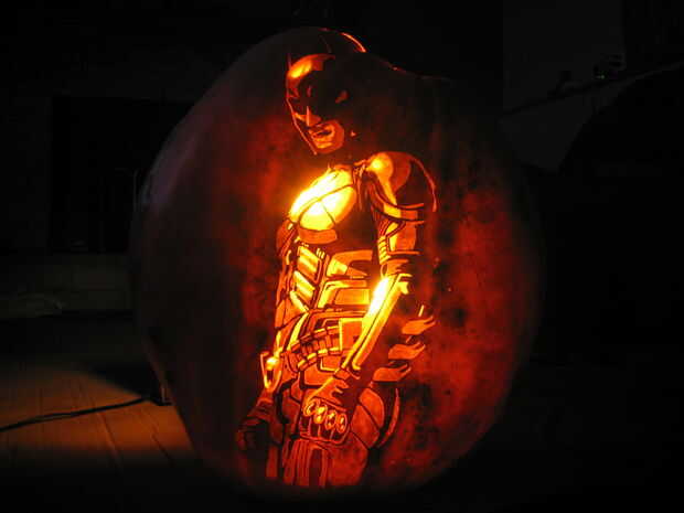 Estas reglas básicas de la talla se aplican esencialmente a la calabaza entera simplemente siguiendo el código de colores establecido en el paso 2. Las fotos siempre muestran el Batman parcialmente terminado, entonces el Batman totalmente terminado, pero con ningún fondo todavía.