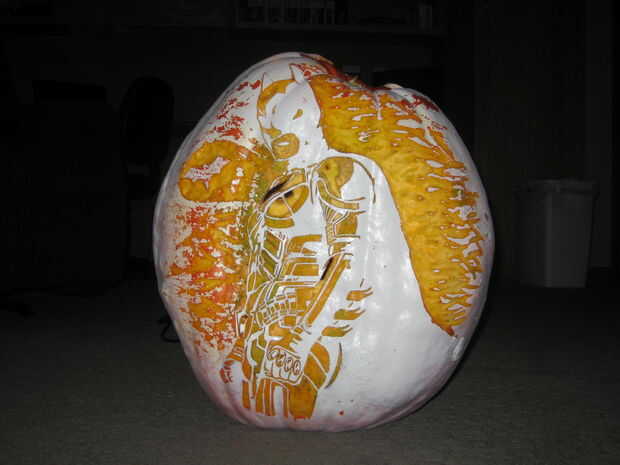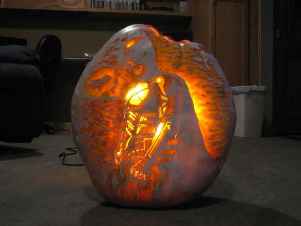 Esta calabaza un poco necesitaba algo extra, así que decidí agregar un fondo. Una vez más, el efecto parece bastante detallado, pero es realmente bastante fácil. Primero agregué la "señal de murciélago" dibujando un contorno áspero de Bat con un óvalo irregular alrededor de él. Entonces simplemente tomé una herramienta de pulido y la Dremel y tallada aproximadamente alrededor el contorno del murciélago que permiten que la luz brille a través de alrededor de él. Esto proporciona el efecto de tipo expositor. El fondo restante se realizó simplemente usando la herramienta de pulido aproximadamente hacerse un patrón irregular alrededor del contorno de Batman y la Dremel para el retiro rápido de la carne de calabaza. Tallado más profundo en la calabaza muy cerca de la espalda para dar la apariencia de luz difusa y talla menor como más alejado del contorno.