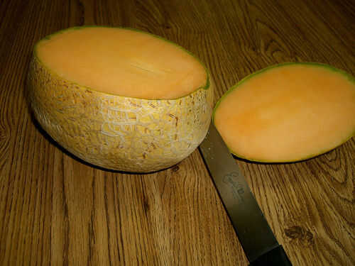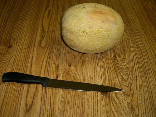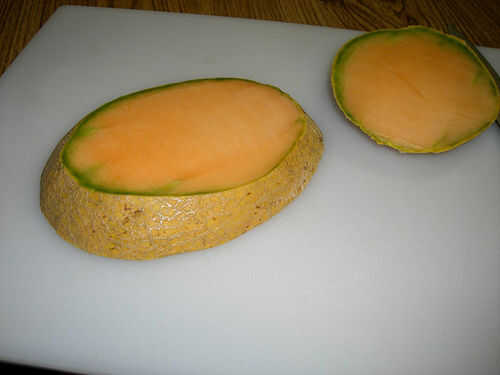 Para empezar cortamos un lado (aproximadamente dos pulgadas vale la pena) de melón para hacer un fondo plano.  Hacer no tiro de esta pieza, ya que esto servirá para tallar la cabeza.