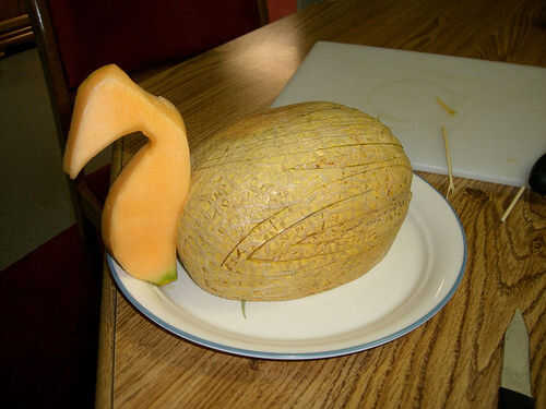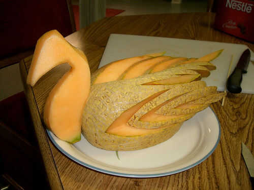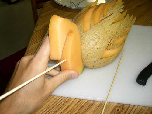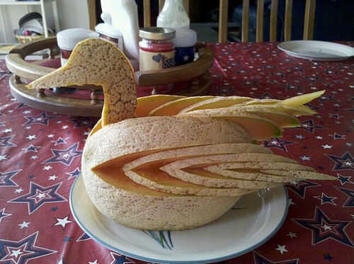 Las alas en abanico y mostrar tu obra maestra. Use su imaginación, hacer flores, Cañas, etc. con otras frutas y verduras. Me gusta particularmente el centro de una bandeja de fruta hermosa y colorida.
