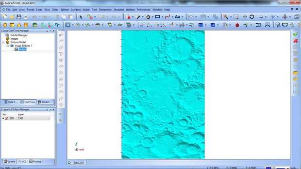 Uno se ha ajustado a los grises en su selección, puede ser trabajado con un software de CAM. Uso BobCAD porque realmente puedo pagarlo y no tengo paciencia o conocimientos para hackear mis propio soluciones. Los procesos que utiliza BobCAD son estándares en la fabricación asistida por ordenador. Como seleccionar tamaños de herramienta, limitación de profundidad-por-pasa, ajustar anchos, etc.. Se utilizo BobCAD como ejemplo, pero las características de que uso deberían estar disponibles en cualquier paquete de CAD/CAM. De nuevo, este no es un tutorial sobre cómo utilizar su sistema de CAD/CAM/CNC, es sobre la superficie lunar.