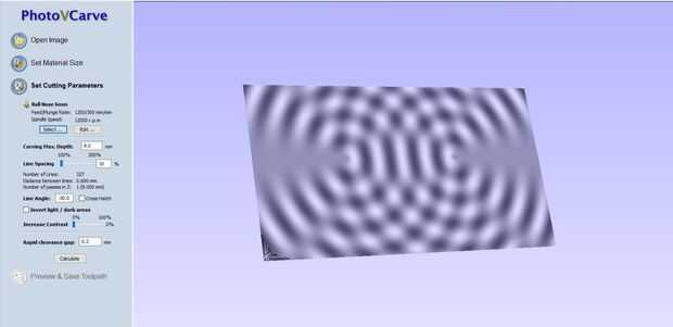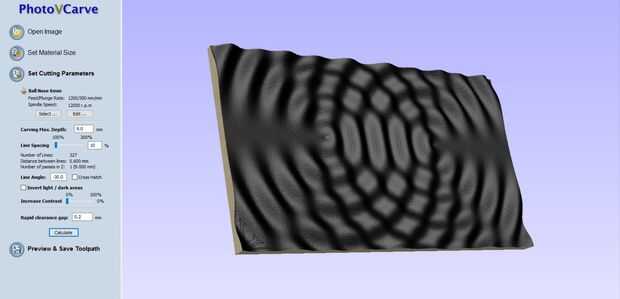 Alternativamente puede utilizar PhotoVCarve o simplemente VCarve que es lo que prefiero utilizar. Esto le permite importar imágenes y genera trayectorias de herramienta de la imagen. Tiene una versión de prueba gratuita pero deja molestas marcas de agua en la imagen.