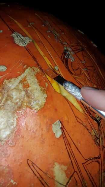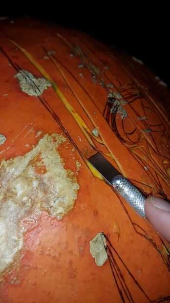 Utilice el cuchillo x-acto punta plana piezas lejos "plano" de la calabaza. Esto se hace en varias profundidades, permitiendo más o menos luz a través de dependiendo si se toma más o menos calabaza carne.