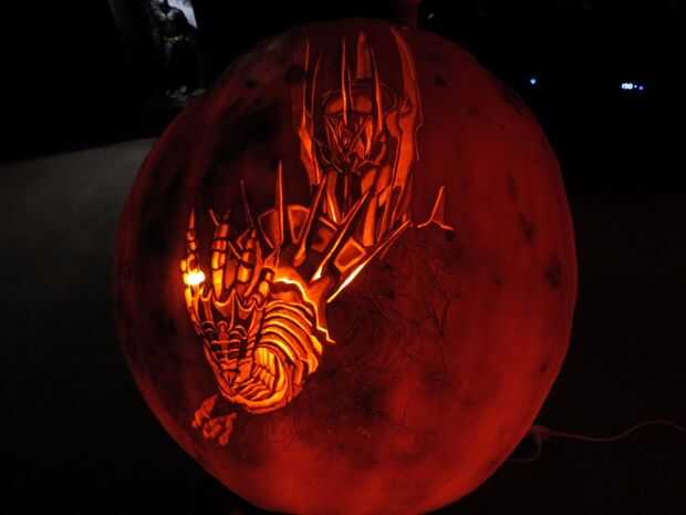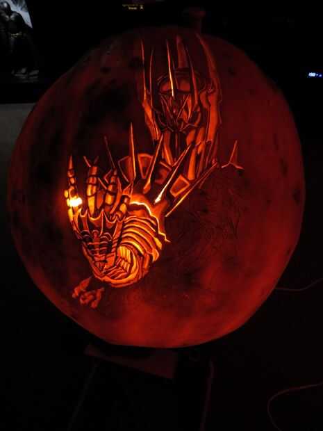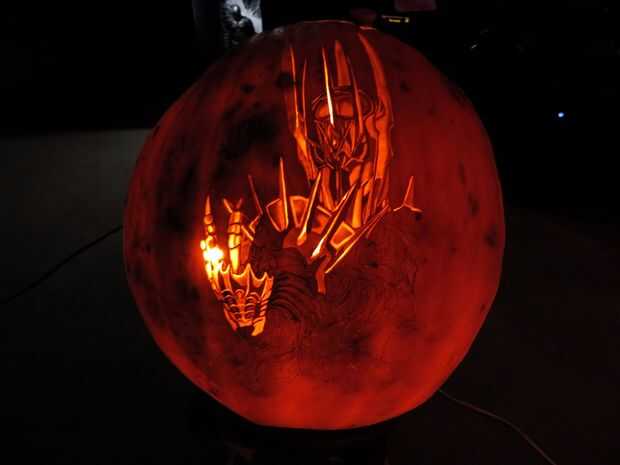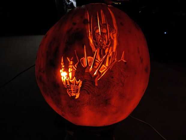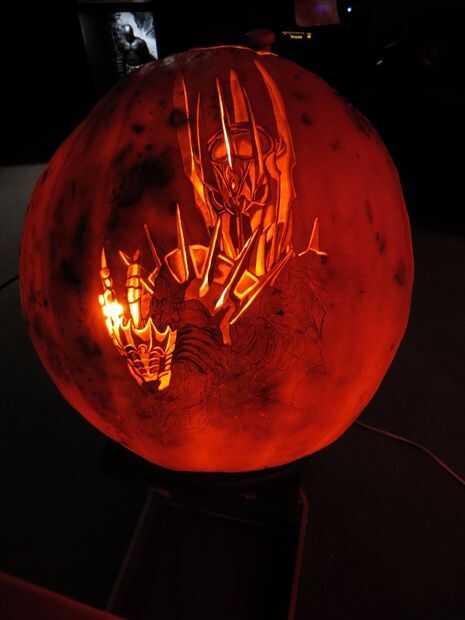 Mano, el guante y el brazo de Sauron son la zona más detallada y difícil de la talla toda. Una vez más, se mueven lentamente. En general, con zonas muy detalladas como esta, te recomiendo las porciones más profundas de talla en primer lugar, seguido por cada capa de sucesivamente menor. Esto tiende a evitar el daño a las porciones previamente talladas de la calabaza.