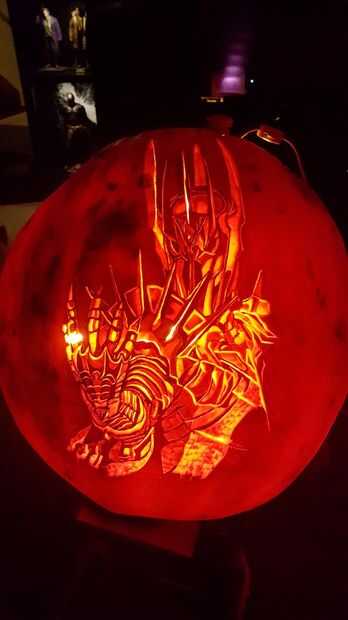 Hay algunas áreas de toda talla para ser consciente de, sobre todo alrededor de la armadura del cuello y escote. Algunas de las porciones más profundas de la armadura están labradas a través de todo el camino con una hoja dentada para permitir un poco de luz extra a través de. En estas áreas que me no preocupaba físicamente quitar los trozos de calabaza, algo usando la cuchilla sólo adelgazado la calabaza en estas áreas lo suficientemente para permitir la luz adicional a través de buenos reflejos.