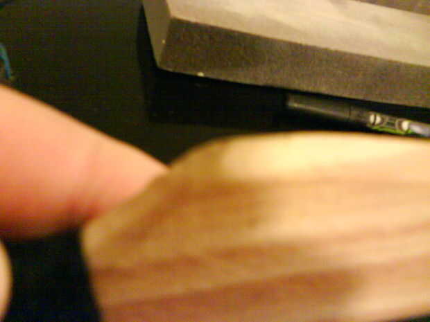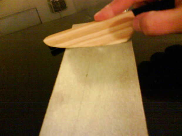 Ahora es difícil de explicar. En el mango, talla suavemente la esquina de hacerlo redondo y fácil de mantener como un cuchillo real. Pastan suavemente las esquinas de la manija con la afeitadora en la redonda de la manija. Para afilar, ángulo de la maquinilla de afeitar y afeitar suavemente la parte de la hoja a un ángulo. También se puede lijar la lámina en un ángulo en lugar de talla.
