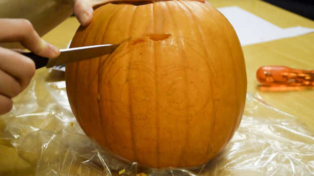 En este diseño debe ser particularmente cuidadoso corte alrededor de los ojos y las cejas ya que sólo están separados por delgados trozos de calabaza.