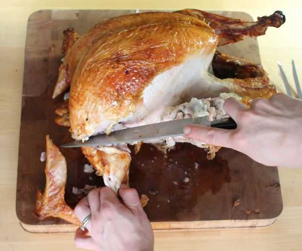 Usando una técnica similar, tire el ala lejos del cuerpo del pavo, con su cuchillo para rebanar a través de la piel circundante.