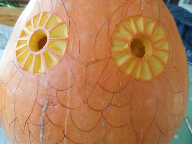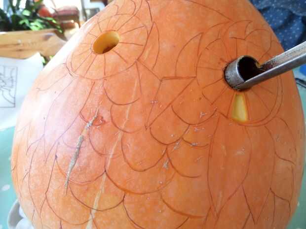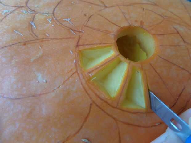 Luego usé el cuchillo pequeño bisturí cortar la piel de la calabaza, quitando la capa naranja pero no va todo el camino a través.
