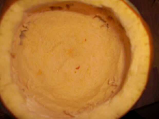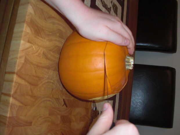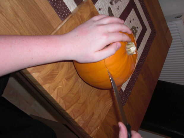 Cuando esté satisfecho con su línea necesita picar de su cabeza. Ir a lo largo de su línea con el cuchillo grande que lo corte poco a poco. Asegúrese de que su corte está en ángulo hacia adentro para que la tapa no caiga en la calabaza cuando haya terminado. También Recuerde cortar lejos de usted así que usted no consigue cortar. Una vez que la cabeza se deben sacar todas las cuerdas y las semillas. Usando el cuchillo y la cuchara, tomar todo y disponer de él o usarlo para hacer sopa de calabaza. Otra vez la elección es suya