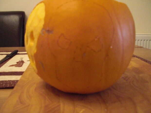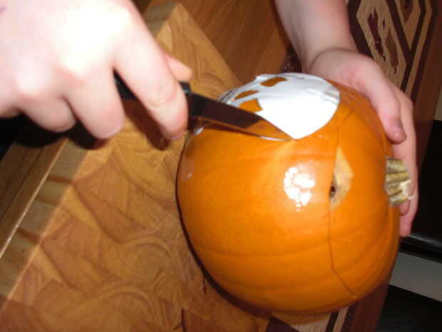 Cuando encuentre una plantilla, que se adapta a la calabaza e impreso, necesita cortarlo hacia fuera. Cortar alrededor del exterior de la forma que quieras y cinta adhesiva en la parte superior e inferior en el lugar que usted quiere cortar en la calabaza. Marque la línea de la plantilla, como la cabeza, utilizando el cuchillo pequeño. Cuando todo está marcado, cortado las características tales como ojos, nariz etc no te preocupes demasiado en las características de corte como usted será ser sacarlos de todos modos pero trata de no salir de las líneas. Asegúrese de que usted corte hasta entonces empuje las piezas a través de la parte exterior de la calabaza. A veces ayuda si empuje en primer lugar y también no te preocupes si salen en pedazos pequeños. Puede que necesite utilizar el cuchillo para ayudar a piezas gratis.