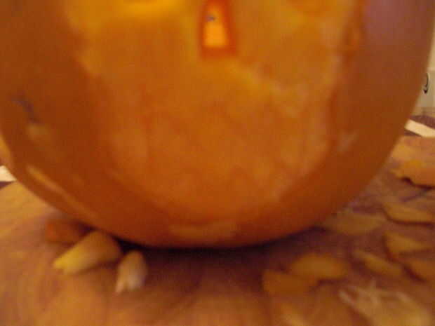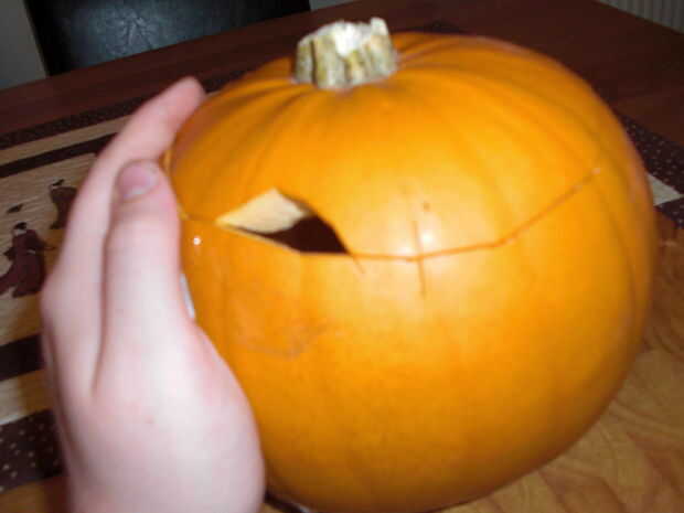 me di cuenta de que los dientes de mi plantilla sería muy difíciles de cortar con éxito así que decidí que les dejan y luego cortar mi propio diseño. Para ello, nuevamente marcan su diseño con el cuchillo pequeño y ajustar hasta que estés feliz. Al igual que antes, ahora deben recortar el diseño, también con el cuchillo pequeño y empuje hacia fuera. Esto es fácil de hacer, especialmente cuando tienes una calabaza suave. Si usted está luchando, no te preocupes y no presiona a duro. Si lo hace entonces el cuchillo irá más allá de que marcas y arruinar su diseño. En su lugar facilitar suavemente el cuchillo en posición. También recuerda que se puede sacar el cuchillo y no tratar de dar vuelta alrededor de las esquinas agudas potencialmente romper el cuchillo.