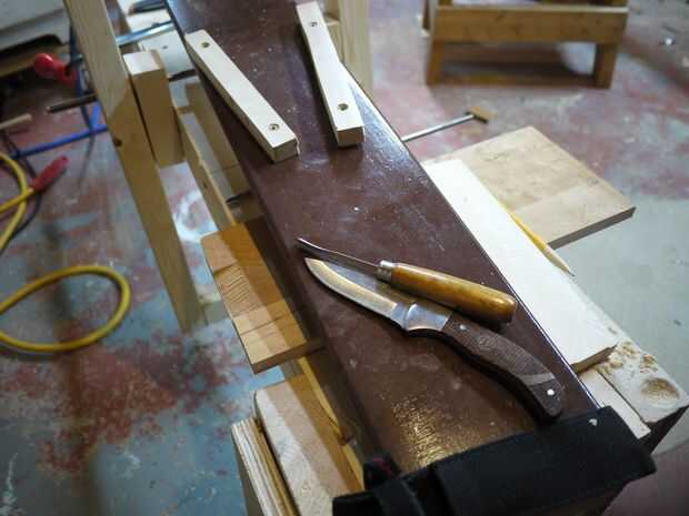 El cuchillo se utilizará para formar el cuerpo de la cuchara. La gubia del tazón de fuente para ahuecar la cuchara. Y el papel de lija para limpiar para arriba