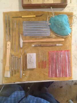 1. mascarilla 2. Martillo pequeño 3. un guante de cuero de 4. Pequeño trozo de piedra de alabastro (hielo alabastro en cuadro) 5. Selección de la aguja 6. Gruesos y finos raspadores y ficheros (pequeñas y medianas en tamaño) 7. Destornilladores Mini reloj (usados como cinceles) 7. arcilla tallado herramientas de detalle desde alabastro es una piedra suave.