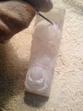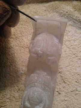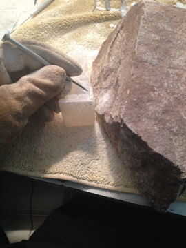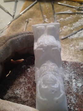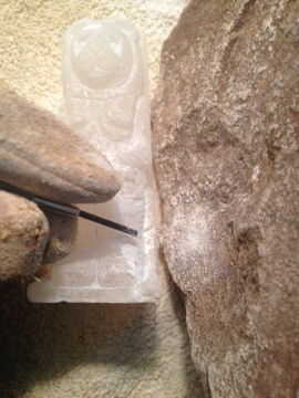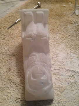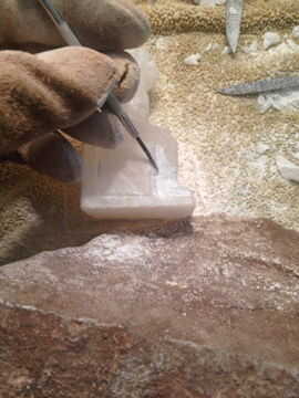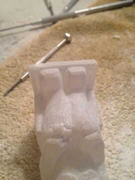 Después talla la cabeza y el torso y bloquear las manos y el ankh, empezar a trabajar en las piernas, rodillas y pies. Utilice el misma reducción, alivio talla técnica como antes para revelar al menor la mitad de la estatua.