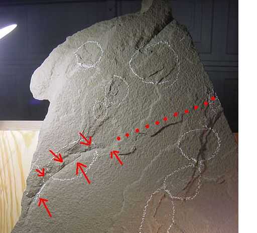 La falla grande en la parte superior de la piedra es muy profunda y hay un adicional fallos 4 arriba de la piedra. Me decido a quitar la parte superior de 1 pie de la piedra. Las flechas indican la falla principal y la línea quebrada línea corté para quitar la parte superior. Incorporo el defecto para minimizar el esfuerzo. El corte inicial se realiza utilizando un cincel plano y un maul de 2 lb. El defecto es profundizado I