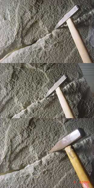 El lado de la espiga de un martillo de bush se utiliza para profundizar en mi corte. El martillo se utiliza para eliminar material más rápido pero requiere más habilidad. Este proceso se denomina percusión directa, en contraposición a la percusión indirecta que utiliza un cincel cincel tiende permitir mayor precisión a costa de velocidad. Una vez que estoy satisfecho con la profundidad hasta cambiar un martillo de albañiles, para iniciar una línea de fractura.