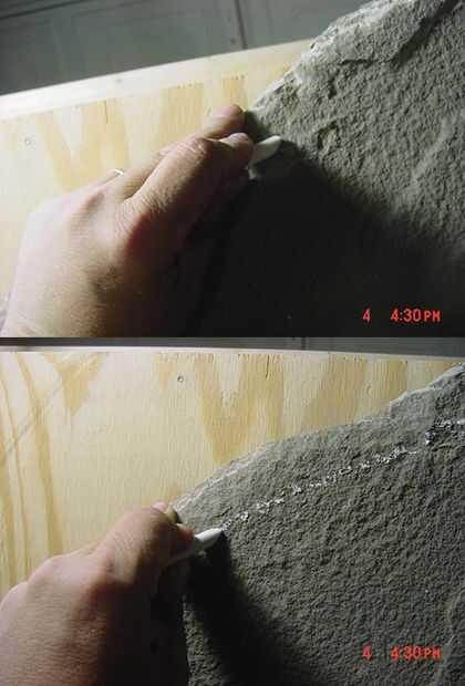 Después de todos los defectos que pueden causar problemas son eliminados o resuelto lo contrario, paso una hora o dos estudiando la piedra y teniendo en cuenta que estilo y forma de uso. Me decido a usar un estilo tardío de híbrido basado en Oepir, que incorporará aspectos de la Edda poética. El primer paso es con tiza y mi mano como una pinza dibuje una línea que marca los bordes y definir los límites trabajarán dentro de.