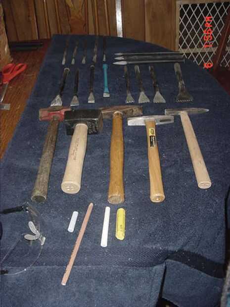La herramientas en la imagen aquí representan aproximadamente un cuarto de esos en mi trabajo la piedra, es irónico que fuera más entonces 100 herramientas la mayoría del trabajo se realizará con sólo dos, mi trineo ligero y pesado punto. En toda escultura libre todos ellos podrían muy bien utilizarse