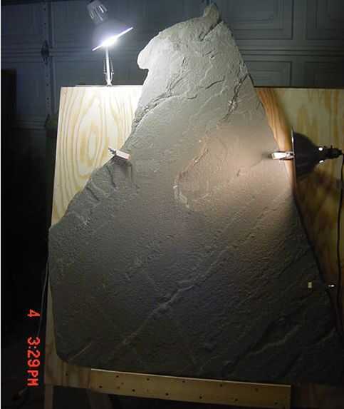 Esta piedra es una losa de piedra caliza. Ser piedra caliza es una piedra sedimentaria, que significa que viene desde el fondo de un mar desaparecido durante mucho tiempo. Este espécimen particular proviene de Pensilvania y es cerca de 120 millones años. También viene de relativamente alta en los estratos y por lo tanto se consideraría una presión media piedra o de una dureza 5 en una escala de 1-10. parece estar libre de fósiles y otras inclusiones pero hay numerosas separaciones escama y estratos. La piedra está montada en el caballete. Actualmente es 5 ½ pies de altura y pesa aproximadamente 220 libras. Construí este caballete para el propósito. Después de tratar de subir la piedra usando varias palancas finalmente sólo lo agarró y levantado en posición, que es cerca de 18 pulgadas sobre el nivel del suelo. En el futuro el caballete se hará más rígido y dos personas usado para montar la piedra. El caballete se hace de sus 2x4s y madera contrachapada con cadenas de acero re-enforcement. Hay tres downs hold para mantener la piedra en su lugar contra el riel inferior. Se agregaron dos luces de área para el trabajo interior. Inicialmente esto fue construido para una demostración de Ren Faire, honestamente prefiero trabajar en el suelo, algunas personas hacen platos