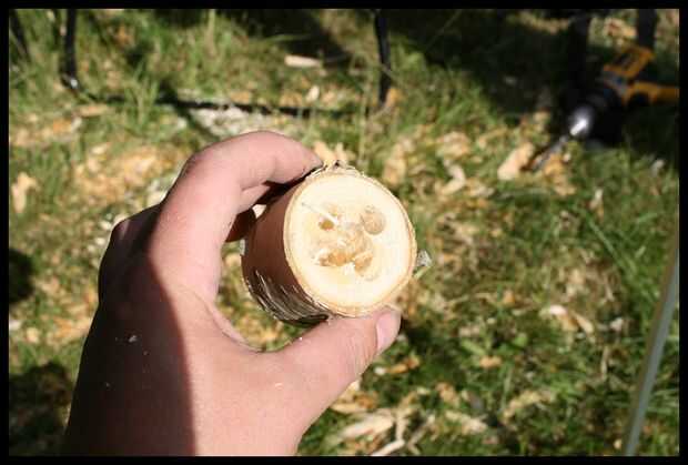 Drill the holes before you cut it. De esa manera es más fácil mantener la madera, y no necesita un dispositivo de sujeción.