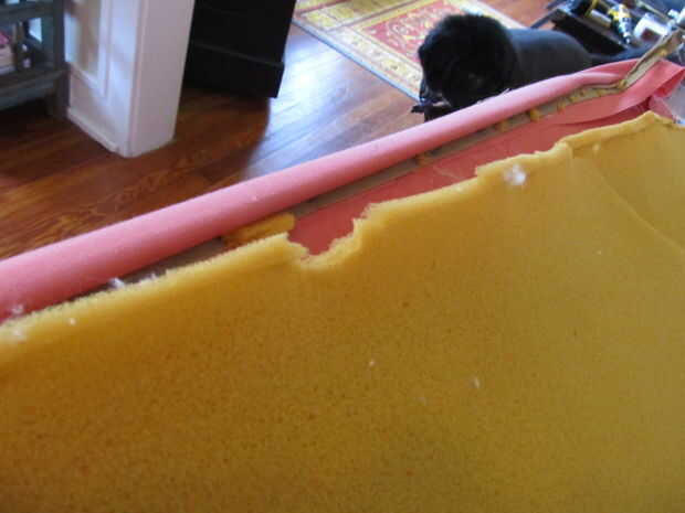 Se trata de una foto (no muy buena) de la parte posterior de la silla. Quería señalar cómo fue unida a la estructura: el fabricante no utilizó capas agarre aquí. En cambio, el panel fue aparentemente Unido en el borde superior en primer lugar, con los dos lados con el agarre de la capa. Esto puede tener más sentido más adelante, pero es importante que usted mantenga cualquier espuma o cartón forro por lo que se pueden reutilizar para guardar sus bordes lisos.