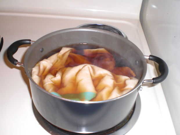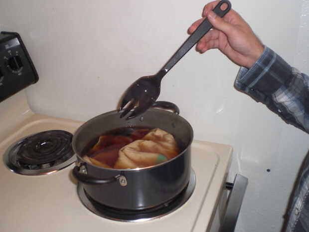 8. tela sumergirlo en el té caliente durante 1-2 horas, dependiendo de la cantidad de tela que está muriendo y tu color deseado (usted no puede realmente ir mal aquí, sólo utilizar su vista para medir la coloración). Revolver de vez en cuando para asegurarse de que han formado pliegues ni burbujas de aire.