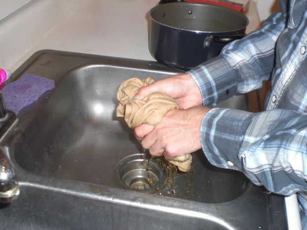 10. una vez 1 tina cuenta con drenado, use las pinzas para escurrir exceso té en la tela en bañera-1. ADVERTENCIA: Recuerde que su tela es caliente en el agua hirviendo. Después de enfriar por unos minutos, el tejido debe ser lo suficientemente frío como para sacar con las manos.